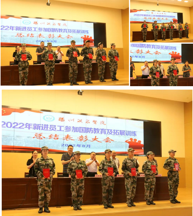 为适应新形势下医院快速发展的需要,全面提升人才队伍建设,自8月1日起,我院74名新进员工来到扬州拓展训练基地,进行了为期五天的封闭式国防教育及拓展训练。8月5日上午,新进员工在经过艰苦训练和汗水的洗礼后,迎来了汇报表演暨总结表彰大会。